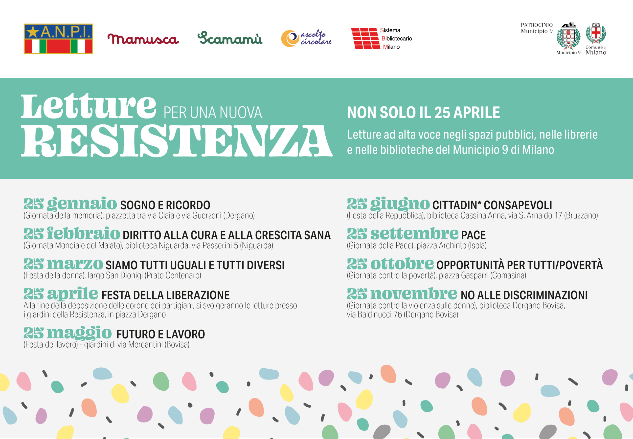 Da un’idea di Francesca Rendano, Mamusca, e Dario Marchesi, Anpi Dergano, nel corso del 2022 sono state realizzate 9 letture, una per ogni 25 del mese, che hanno visto coinvolti più di un centinaio di bambini in 6 piazze e 3 biblioteche del Municipio 9.