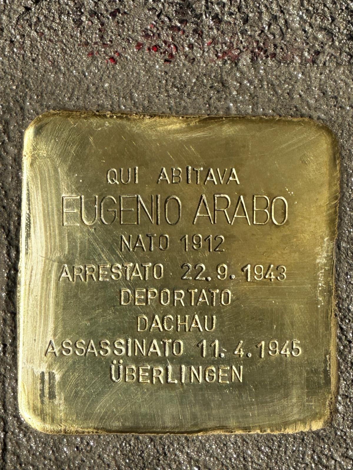 Eugenio Arabo nasce il 23 ottobre del 1912. Sergente maggiore dell’esercito, in fanteria, dopo l’8 settembre è arrestato e condotto nel carcere militare di Peschiera del Garda. Il 20 settembre, con il trasporto n.2 è deportato insieme ad altri 1790 militari a Dachau. Muore l’11 aprile 1945 a Überlingen, sottocampo di Dachau, tumulato nella fossa comune di Birnau.