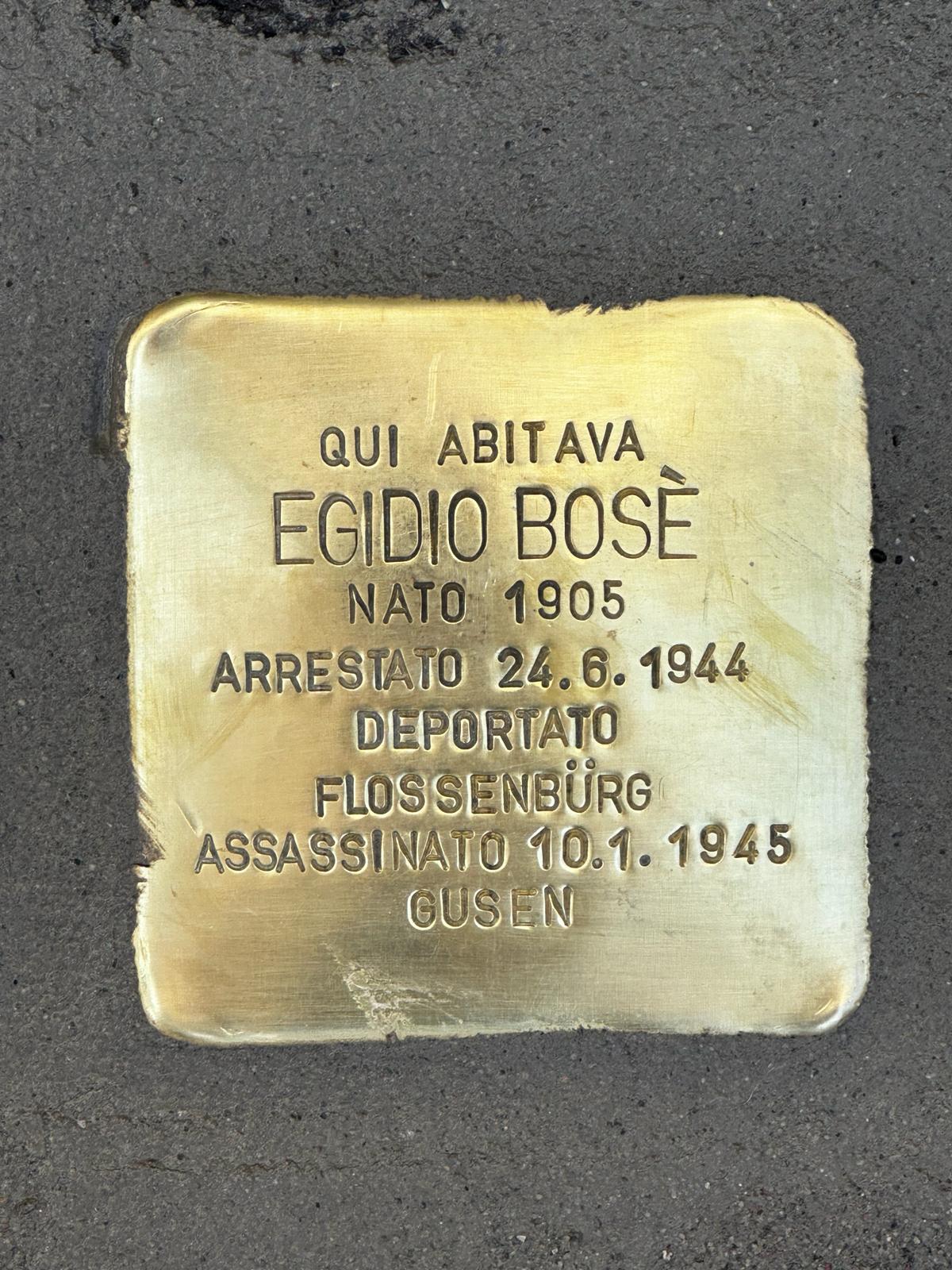 La seconda pietra d’inciampo è stata posta in Via Cesare Brivio  7 in ricordo di  Egidio Bosè, Presenti numerosi studenti dell’IIS Marelli Dudovic e del liceo linguistico Manzoni.  Egidio Bosè, dopo l’otto settembre partecipava alle attività clandestine dei partigiani del gruppo di Greco, la 112. Brigata Garibaldi. Lavorava come calderaio al deposito locomotive FFSS di Greco. Fu arrestato il 24 Giugno 1944 in seguito all’attentato al deposito locomotive di Greco Pirelli. Internato nel campo di Mauthausen, morì il 10 gennaio del 1945 nel sottocampo di Gusen. Intervento di Alessandra Minerbi, della Presidente del Comune di Milano Elena Buscemi. Chiude la cerimonia uno studente leggendo la biografia.