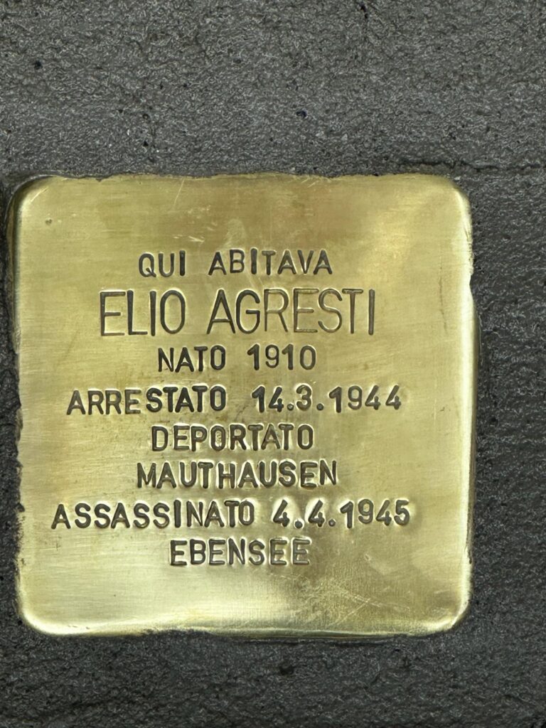 Intervento di Alessandra Minerbi, Elena Buscemi e Dario Marchesi , uno studente legge la biografia di Elio Agresti. Gli studenti illustrano il significato delle pietre d’inciampo con un manifesto e posano dei fiori.