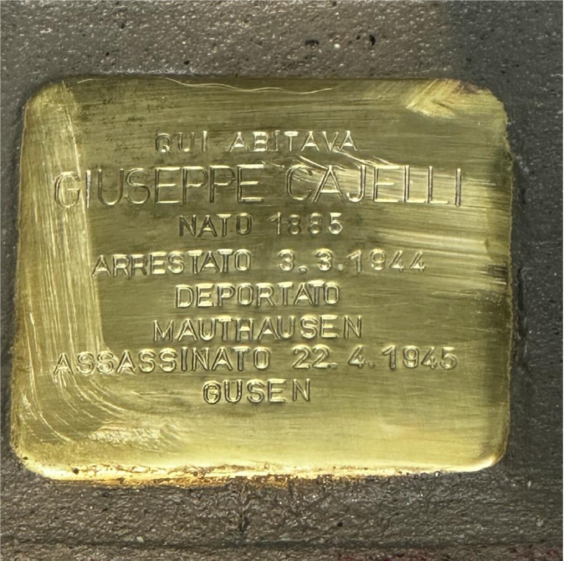 La prima pietra d’inciampo è stata posata in via Bernardino de’ Conti 6 in ricordo di  Giuseppe Cajelli, che lavorava all’Azienda Tranviaria Milanese come controllore e faceva parte del CLN aziendale. Partecipava attivamente agli scioperi del marzo 1944 e per questo fu arrestato a fine marzo a Milano e deportato a Mauthausen. Morì nel sottocampo di Gusen il 22 aprile 1945. Presenti numerosi studenti della scuola media Pavoni-Confalonieri. La cerimonia è stata aperta dall’intervento di  Alessandra Minerbi presidente del Comitato Pietre d’inciampo di Milano, seguita dall’intervento della Presidente del Municipio 9 Anita Pirovano; uno studente ha letto la biografia.